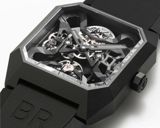 BR 03 Cyber Ceramic陶瓷腕表设计出众,哑黑色外观低调却抢眼,代替传统制表界常用的贵金属,42 x 43.7毫米表壳以高科技陶瓷制作。 高科技陶瓷制作涉及非常复杂的高温烧制技术,物料具有轻巧,高硬度及高抗磨损特性。 Bruno Belamich解释说:「表壳及零件经过钻石粉打磨,有如珠宝工匠打磨切割名贵宝石一样。 为了造出简洁纯净风格,设计师剔除了表耳部份,将橡胶表带直接嵌入壳两则位置。」此外,防眩蓝宝石玻璃表镜内侧镶贴了12个亮黑色金属时标及标志。