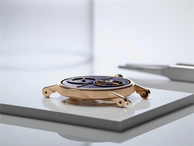 “神秘陀飞轮”是宝玑制表大师们掌握的一项引人瞩目的复杂功能。陀飞轮框架的表桥和支撑底座通常经精心修饰,在这款新品时计中,则采用蓝宝石制作,并经防眩光涂层处理,纯净透明,在视觉上仿若隐匿无形。