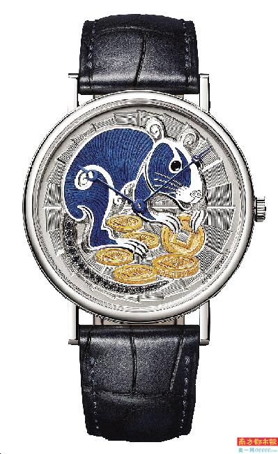 宝玑(Breguet)推出以中国十二生肖中子鼠为装饰元素的全新时计臻品,将备受其珍视的手工镌刻、大明火珐琅、玑镂刻花以及宝石镶嵌等手工匠艺共同呈现于腕表之上。手工镌刻工艺需将图案镌刻于尺寸往往非常微小的零部件表面之上。此外,宝玑珐琅工艺大师还将内填珐琅工艺运用于该枚腕表上,运用凿刀留白出需上色的区域,随后于其内填入珐琅,烧制并完成打磨。超薄表壳内搭载厚度仅为2.4毫米的自动上链机芯。该枚腕表仅限量发售8枚。