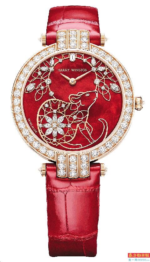 海瑞温斯顿(Harry Winston)特别推出玫瑰金卓时PremierTM系列限量鼠年生肖36毫米自动腕表。这枚腕表的表盘运用了“锦簇镶嵌”这一工艺,将不同切工的钻石依照设计巧妙排列镶嵌,8颗马眼形切工钻石围绕着中心位置的一颗圆形明亮式切工主钻,构成一朵绽放的花朵,也突显了子鼠的身体设计。表壳采用18K玫瑰金打造而成,共镶有57颗圆形明亮式切工钻石,包括表冠和表耳尖端都以钻石精心镶嵌。该枚腕表限量发行8枚。