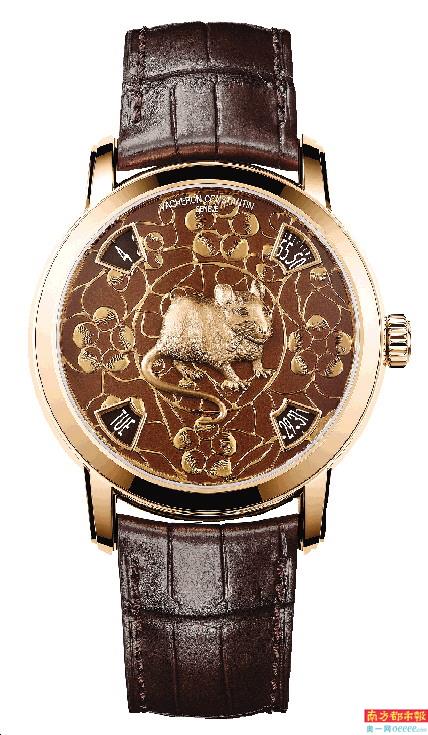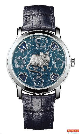 江诗丹顿推出Métiersd’Art艺术大师系列The Legend of the Chinese Zodiac中国十二生肖——鼠年腕表。中国的剪纸艺术与瑞士剪影艺术成为该系列的亮点,雕刻大师和珐琅大师合作,在金质表盘上,以手工雕刻技艺雕成的枝叶装饰图案源自中国传统花卉纹样,将深浅不同的浮雕图案组合在一起,令雕刻的植物仿若悬浮于表盘之上,之后是大明火珐琅工艺的制作。表盘中央的铂金或粉红金生肖“鼠”图案,则经手工雕刻技艺雕琢而成。两款新作搭载2460 G4机芯,限量发行各12枚。