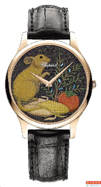 Chopard萧邦以日本传统莳绘工艺打造L.U.C XP鼠年莳绘腕表。萧邦特别采用日本传统莳绘工艺,之后需逐层上漆,且每一层均极为纤薄。工艺大师将生漆和金粉融合,致敬亚洲文化。表盘上,一只金鼠站在玉米穗上,其旁绘制一只柿子,对面还有一束鲜花,呈现蓝、金、绿三种幸运色彩。腕表搭载Chopard Manufacture自制的L.U.C 96.17-L超薄机芯,全球限量88枚。