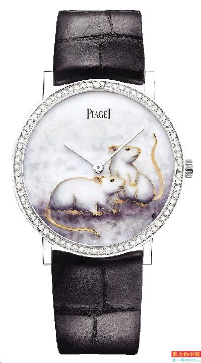 PIAGET伯爵这款以Altiplano至臻超薄系列限定版,18K白金的表壳中搭载厚度仅2.1毫米的伯爵430P超薄手动上链机芯,表圈镶饰78颗晶莹美钻,以大明火掐丝珐琅工艺于表盘上描绘出一对福鼠,这项珐琅工艺有着精细繁复的制作流程,伯爵珐琅工艺大师Anita Porchet在表盘的方寸之间精雕细琢,亦能巧夺天工地演绎出逼真的光影效果,全球限量38枚。